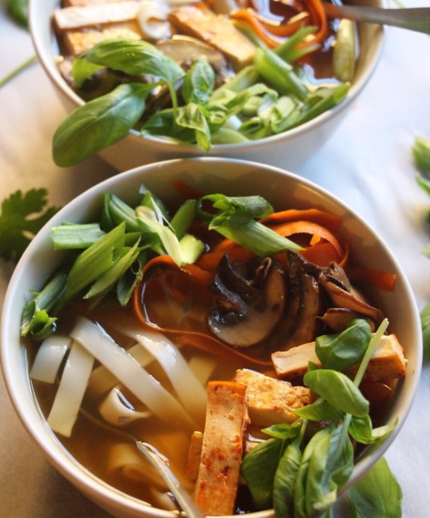 - Ladle the broth into bowls, and add the tofu and mushrooms. Top it with some carrots, spring onions, fresh basil, cilantro and some lime. If required you can use additional toppings like, jalapeño, fresh mint, moong bean sprouts, cabbage or bok choy.