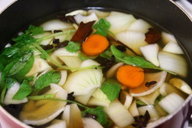 - In a soup pot, dry roast cinnamon sticks, star anise and cloves until fragrant. Add onion, ginger, garlic, carrots, 3-4 stems of basil and cilantro, vegetable stock, water and 4 tablespoons of tamari. Bring this mixture to a boil and then reduce the heat and let it simmer for about 45 minutes to infuse all the flavors in the broth.
