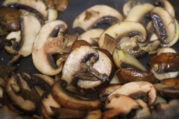 - To prepare the mushrooms, warm a tablespoon of olive oil in a skillet and sauté the mushrooms for 5 minutes. Add a pinch of salt to it while sautéing.