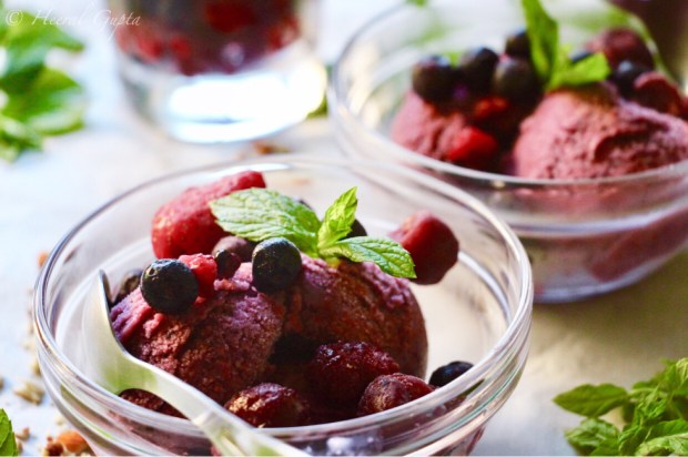 So, few days back i whipped up some nice cream using frozen banana and berries, and trust me i was just blown the way it turned out. It had an amazingly creamy texture like a frozen smoothie, was ridiculously light and airy, had a delicious taste and most of all, was fat free and super healthy. It had a sweet and tart taste from the berries balanced with the smoothness of bananas. I added a bit of honey and vanilla essence for added flavor. Every spoonful of this berry nice cream was a sublime treat. You can have it immediately after blending if you like your nice cream semi frozen or you can freeze it for 2 – 3 hours for a frozen ice cream texture. Nice cream keeps good in the freezer for 2 – 3 days.
