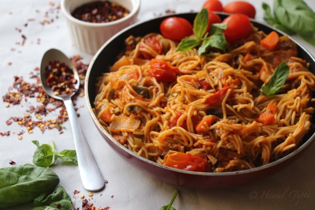 This pasta is extremely simple in execution and it can never fail. I am personally in love with tomato based pasta sauces. This sauce too is made with loads of tomatoes along with some Italian herbs and of course red peppers for the spicy kick in every bite. It is very important to use good quality tomatoes for an extremely flavorful sauce. Just start with sautéing some red pepper flakes, garlic and onions in olive oil and add white wine to it. Once the wine cooks and reduces, we will be left with its wonderful flavors. Then add the tomatoes and the herbs to it and let the sauce simmer. Once done add in your choice of pasta. I used whole grain angel hair as I had it in my pantry. Usually penne goes very well with arrabbiata.