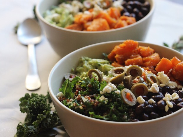 • To serve, divide the quinoa and kale salad, beans, sweet potatoes and guacamole into bowls. Top with crumbled feta and olives.