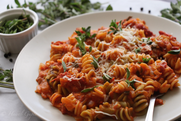 - Pour the sauce over the pasta and sprinkle some fresh oregano leaves and cheese of your choice on the top. Serve hot!