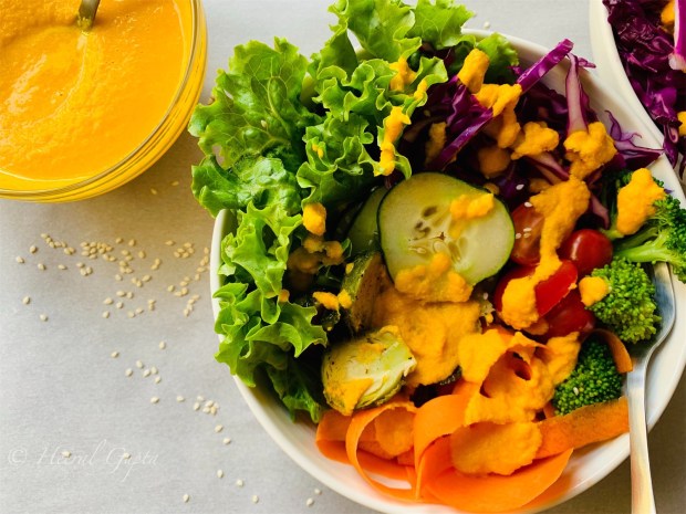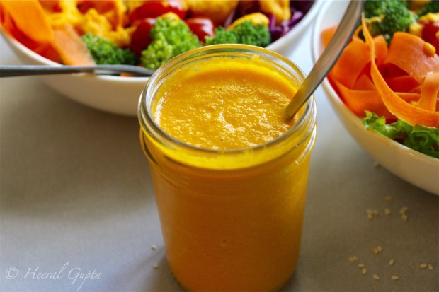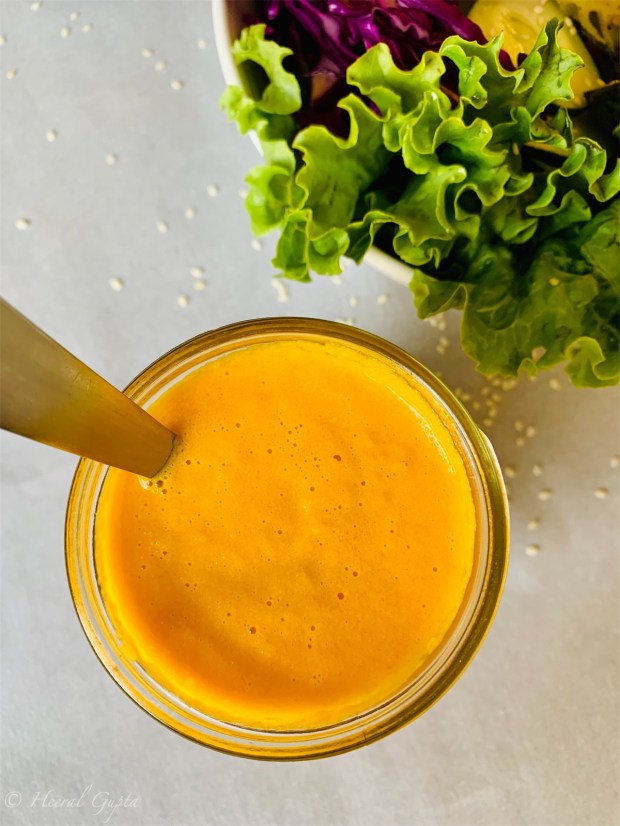 However, the star of this salad is the carrot and ginger dressing. It’s sweet, tangy and zesty with a surprising spiciness of ginger. This dressing has all the ‘good for you’ ingredients starting from carrots which are an excellent source of vitamins, ginger that has healing properties and also aids in digestion and sesame seed oil that is loaded with essential minerals. Along with these, I added olive oil which is apparently a must for any salad dressing, rice vinegar for a bright and nutty taste, lime to adjust the acidity of the dressing and honey to add a little sweetness and balance the sour and tangy flavors.