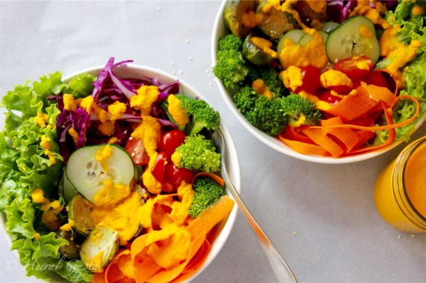 This dressing is super versatile. It pairs very well with any combination of vegetables and protein. While making this salad I was craving something crisp and colorful, light yet wholesome, hence I opted for lettuce, carrots, red cabbage, cherry tomatoes, cucumbers, broccoli and Brussels sprouts. You can always swap lettuce for kale or spinach, add tofu, quinoa or edamame for some extra protein, or add peanuts or toasted almonds for a nice crunch. No matter what vegetable/protein route you take, I swear this dressing is a winner.