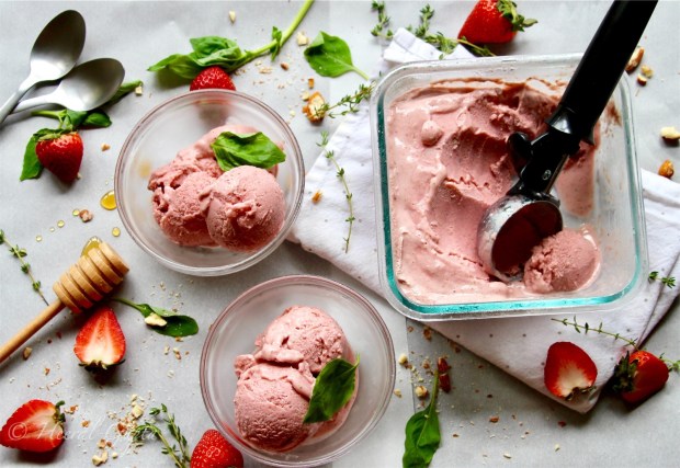 Summertime is for enjoying the sunshine, relaxing by the lake and having lots of frozen treats to keep you cool and refreshed. We had some hot weather in Chicago this week and I had this strawberry basil nice cream stocked up in the freezer all week long.