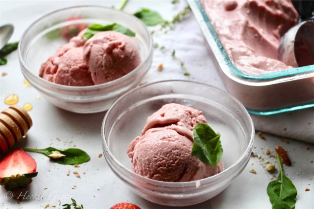 Nice cream, as I have mentioned in my earlier posts too, (berry nice cream, piña colada nice cream) is nothing but frozen bananas and other frozen fruits when blended with yogurt or plant based milk gives a creamy base which is very similar to an ice cream. It’s dairy free and sugar free but certainly not flavor free! For this strawberry basil nice cream, all you need is frozen bananas, strawberries, basil, coconut milk, honey and a high speed blender to transform these ingredients into an irresistible treat. Adding herbs like basil, mint and thyme to nice cream adds a great kick to the overall flavors. You can always play with different combination of fruits and herbs while making your own batch. If you want to pile on the toppings, consider adding berries, chocolate chips, granola, nuts, chia seeds or honey to your nice cream.