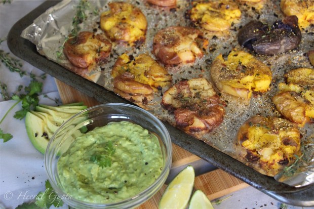 Potatoes I feel are one of the most versatile root vegetables in existence. One can never go wrong while cooking with potatoes. And when it comes to appetizers and sides, chances are pretty high that there’s always a potato based dish you absolutely love. I have till now shared two of my favorite potato sides on my blog – baked fries and mashed potatoes. So now here’s another one to add to my list; smashed potatoes with avocado basil pesto.