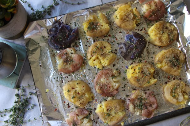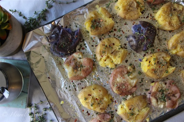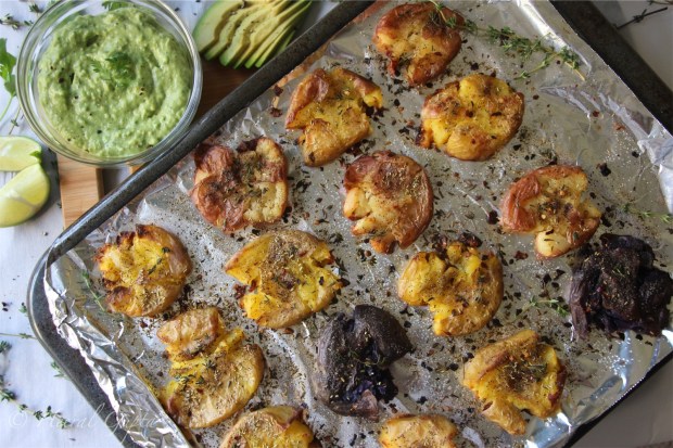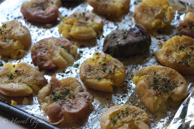 So how do you make smashed potatoes? Well.. it’s pretty simple. Boil the potatoes, smash them, drizzle some oil, sprinkle your choice of herbs and seasonings, bake and enjoy! Yes.. It’s that easy. Also you can boil them off beforehand and store in the fridge. The day you wish to make these, just smash and roast. These taste fab on their own, but even better if you have have something to dip them in.