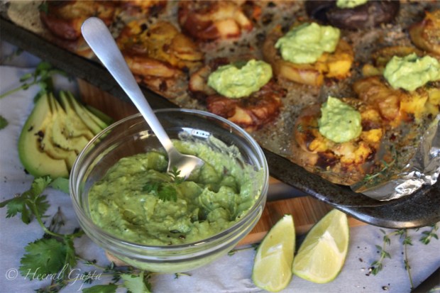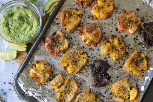 If you’ve never tried them before, you are in for a treat. Smashed potatoes are fluffy and creamy on the inside yet incredibly crisp on the outside. When baked with variety of herbs, its absolute perfection! It’s an easy, pleasing side dish, extremely buttery and delicious and pairing it with avocado basil pesto makes it over the top flavorful with a very little effort.