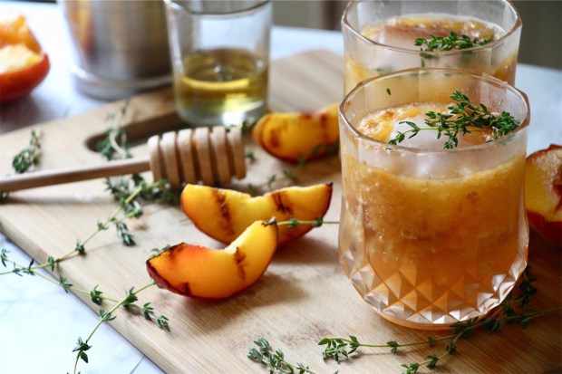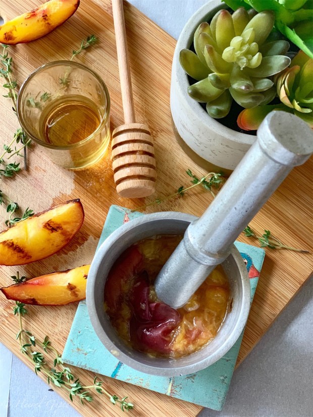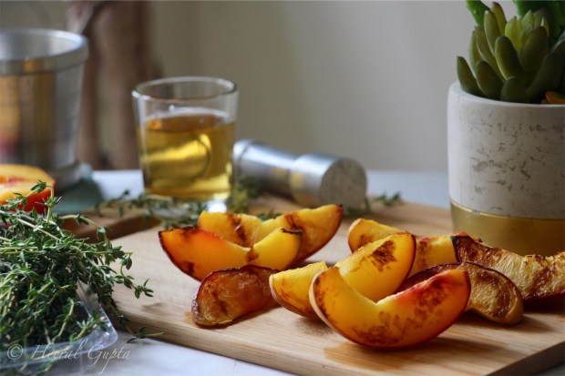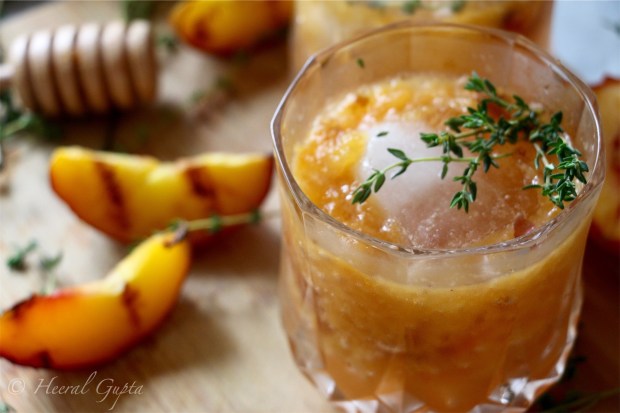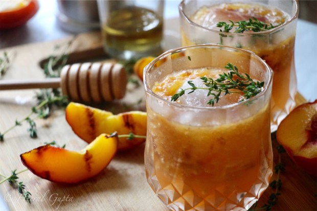 Peaches are stunning these days! Be it grocery stores or farmers market, peaches are popping up everywhere. Biting into a fresh peach is unparalleled for the ultimate summer experience. Peaches are luscious and juicy but when grilled, they caramelize and the smoky taste makes the fruit come to life. I love mixing cocktails with fresh fruits and herbs and this concoction made with grilled peaches, thyme, honey and whiskey is outright a smashing summer refreshment.