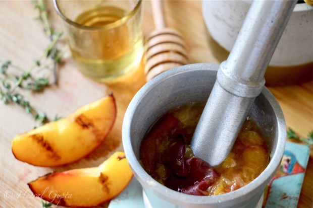 - Now muddle the grilled peaches along with a few strands of thyme.