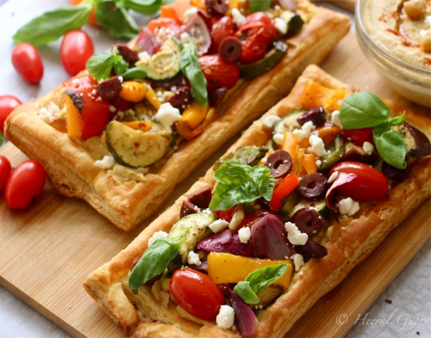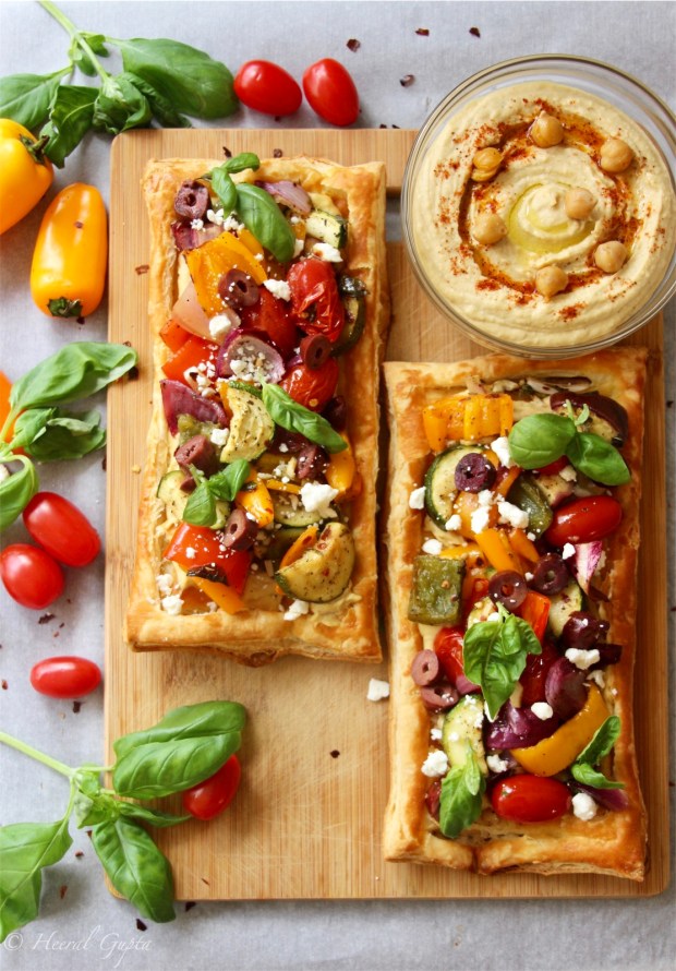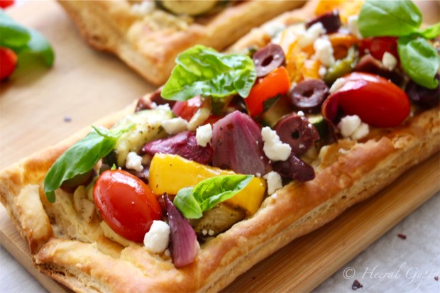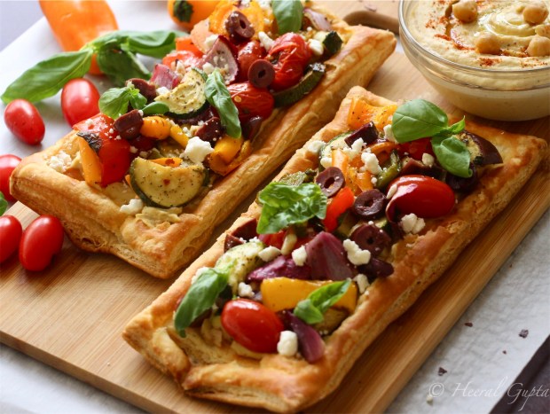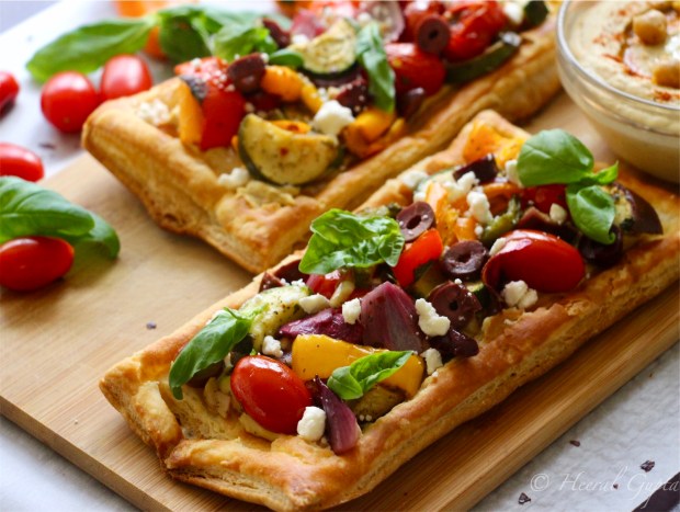 Once the vegetables were roasted and pastry baked, I assembled the tart by first applying a generous layer of hummus on the pastry and then laying the roasted veggies over it. Next i topped it with some kalamata olives, feta cheese and fresh basil. I really loved the way these simple ingredients brought together an authentic Mediterranean taste and made for a fancy and delectable meal.