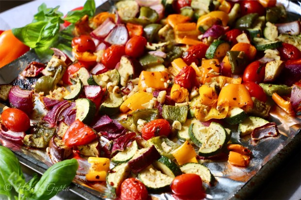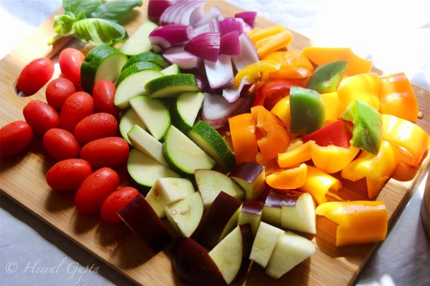 - 2 cups assorted veggies (cherry tomatoes, red onions, zucchini, eggplant, assorted bell peppers)