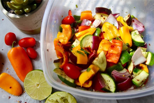 - Place all the vegetables in a bowl and drizzle some olive oil. Add thyme, oregano, fresh basil, red pepper flakes, salt, pepper and lime juice to the vegetables. Give it a nice stir to make sure all the vegetables are coated with spices.