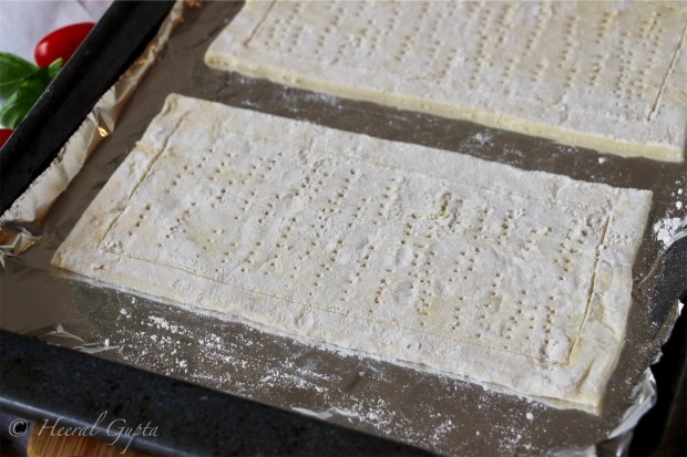 - Meanwhile thaw the puff pastry and cut it in half. Place both the halves on another lined baking tray and score an inch border around the sheet of both the halves. Also prick the middle of the sheet with fork few times to stop the pastry from puffing up too much.